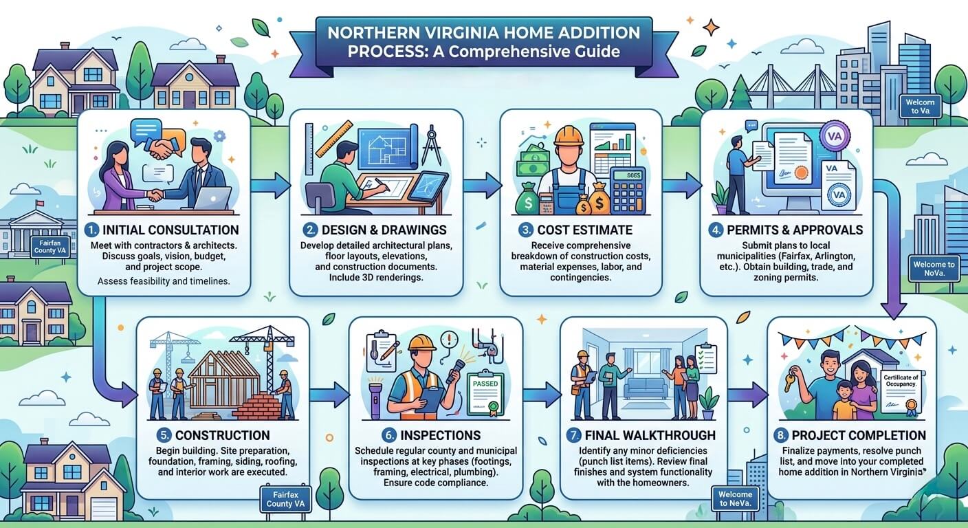 - Set a realistic budget based on home addition cost Northern Virginia averages.